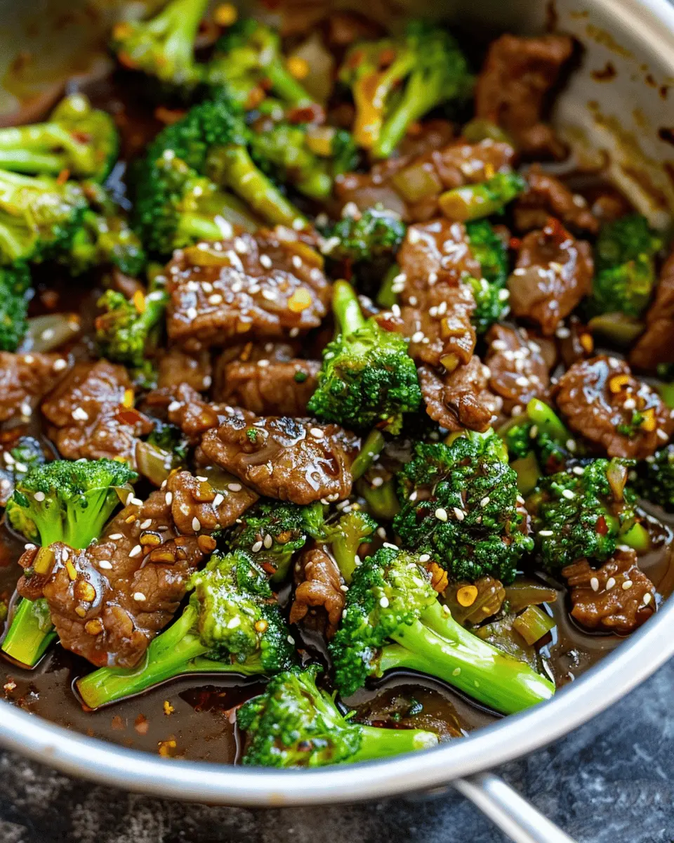 Now comes the fun part! Add your fresh broccoli florets directly to the skillet along with the cooked beef. Pour the savory sauce over everything, and give it a good toss to combine. The steam will help cook the broccoli just right—crisp yet tender. Let everything cook together for an additional 3–5 minutes, ensuring that the beef is fully cooked and the broccoli is vibrant green.