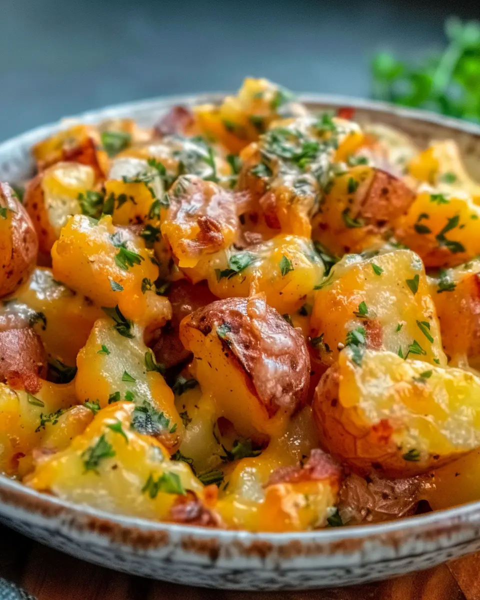 In summary, Cheesy Ranch Potatoes are not just a dish; they’re a comfort food that brings joy to any gathering. They’re incredibly versatile—perfect as a side dish for a weeknight dinner or as a hearty contribution to a picnic. Plus, the combination of creamy cheese and zesty ranch seasoning makes each bite irresistible. Imagine serving them at your next potluck; I promise, they will disappear faster than you can say “delicious!”