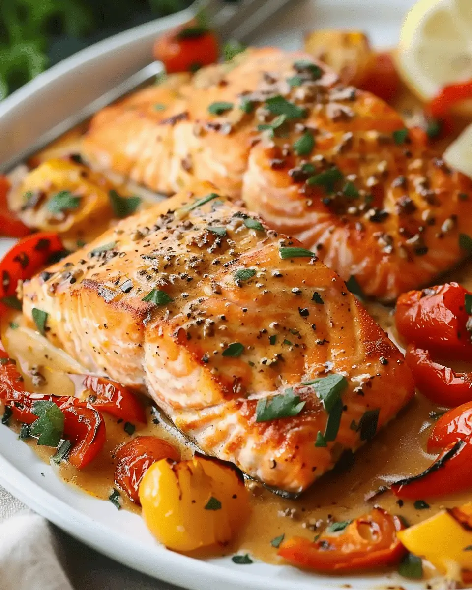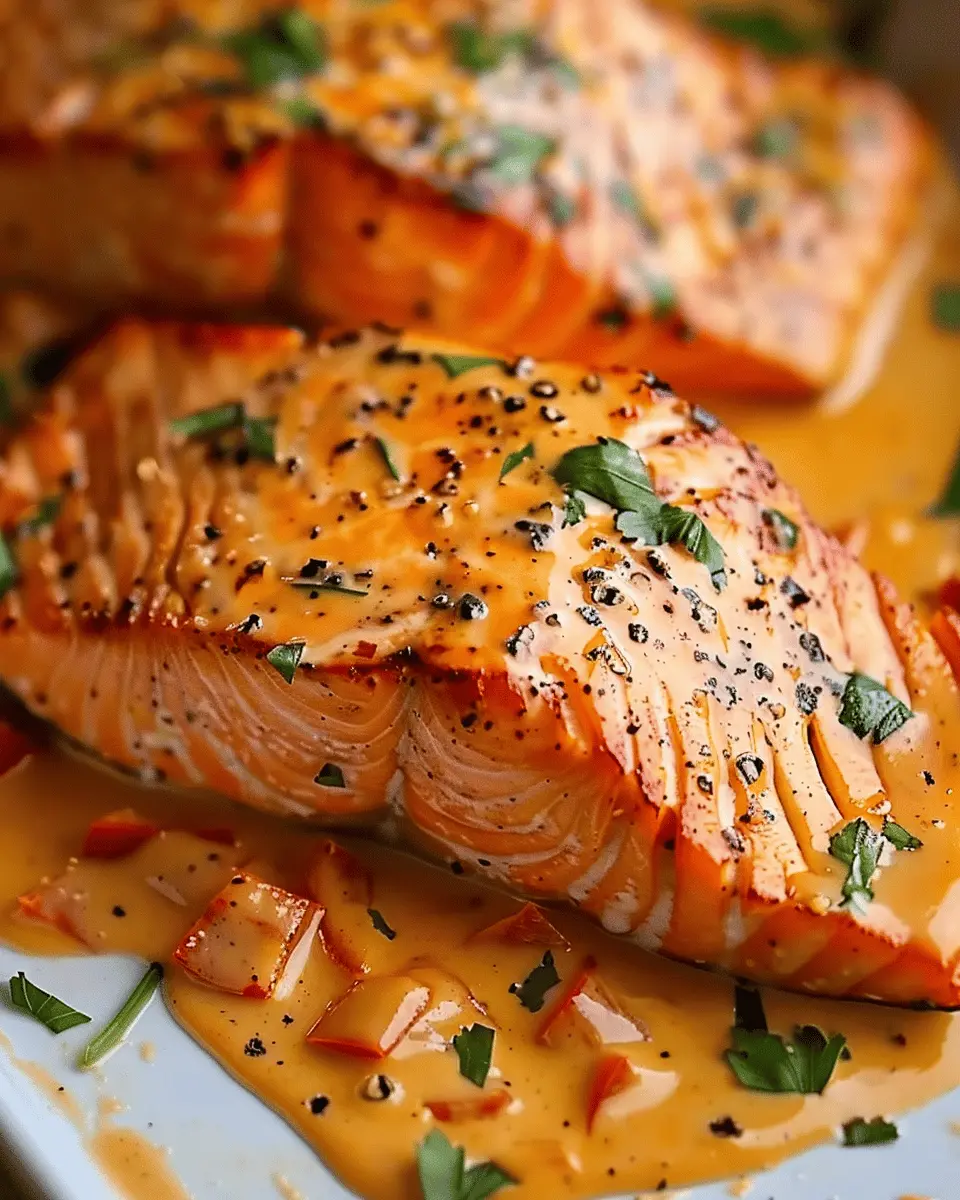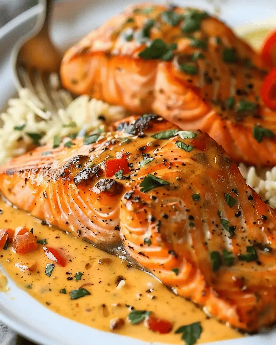PrintCreamy Roasted Red Pepper Salmon Recipe: A Dreamy Dinner Delight
