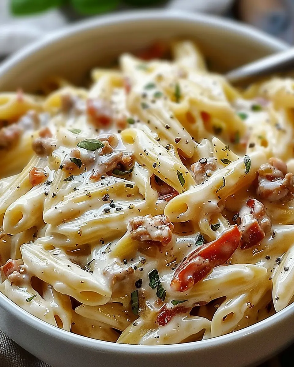 A delicious and creamy pasta dish featuring turkey bacon and chicken ham.