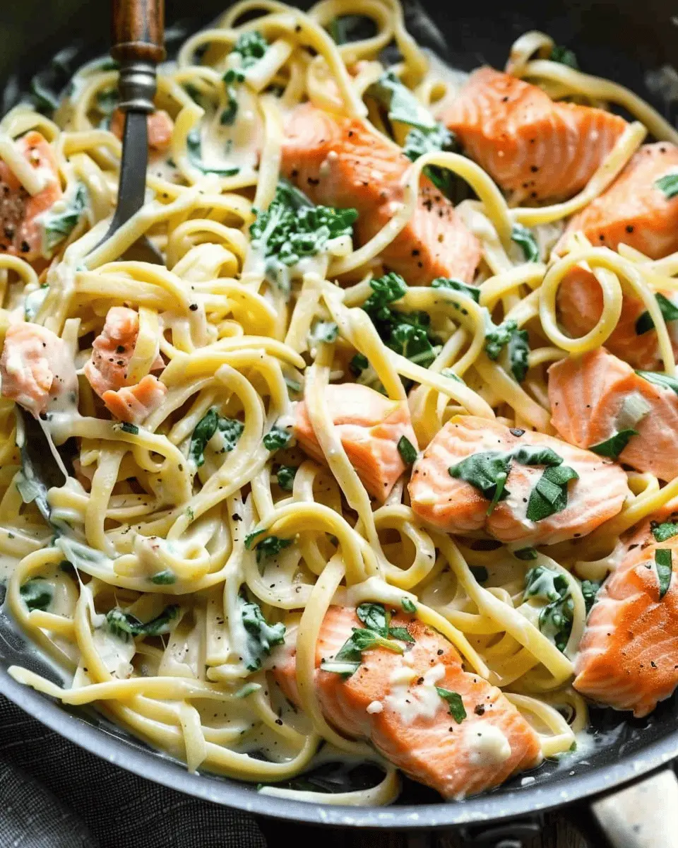 Keywords: creamy salmon pasta, indulgent dinner, pasta recipes