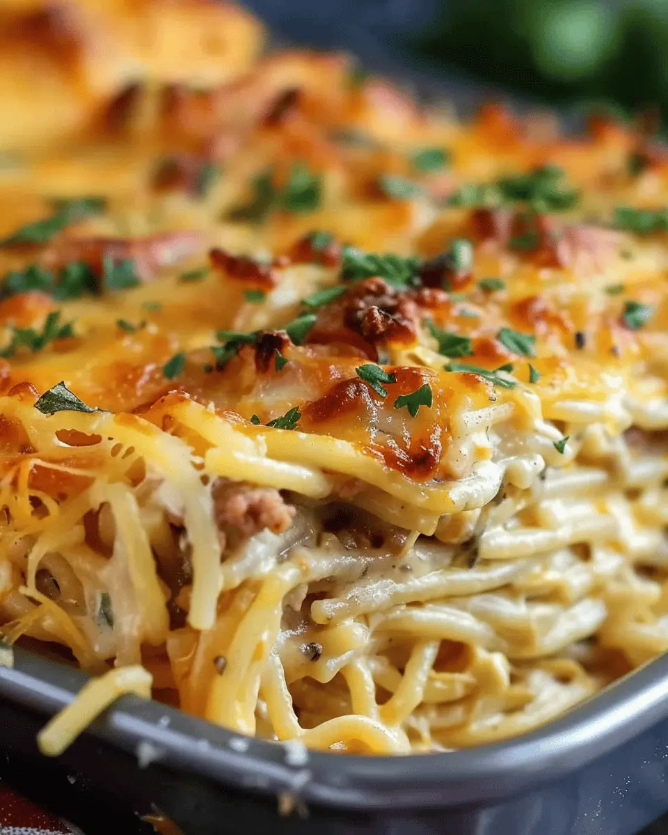 Creamy Southern Spaghetti Bake with Turkey Bacon and Chicken Ham