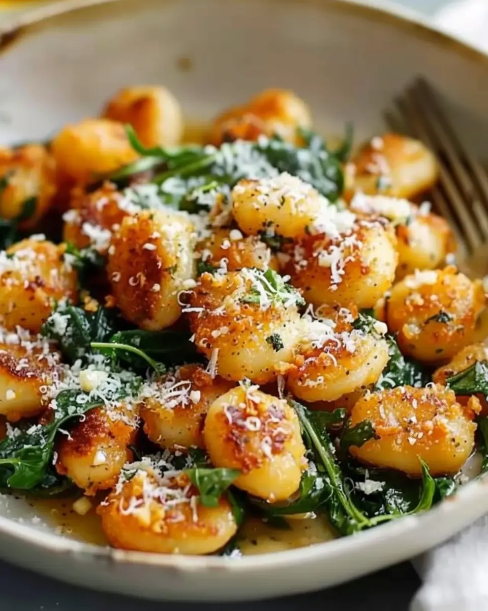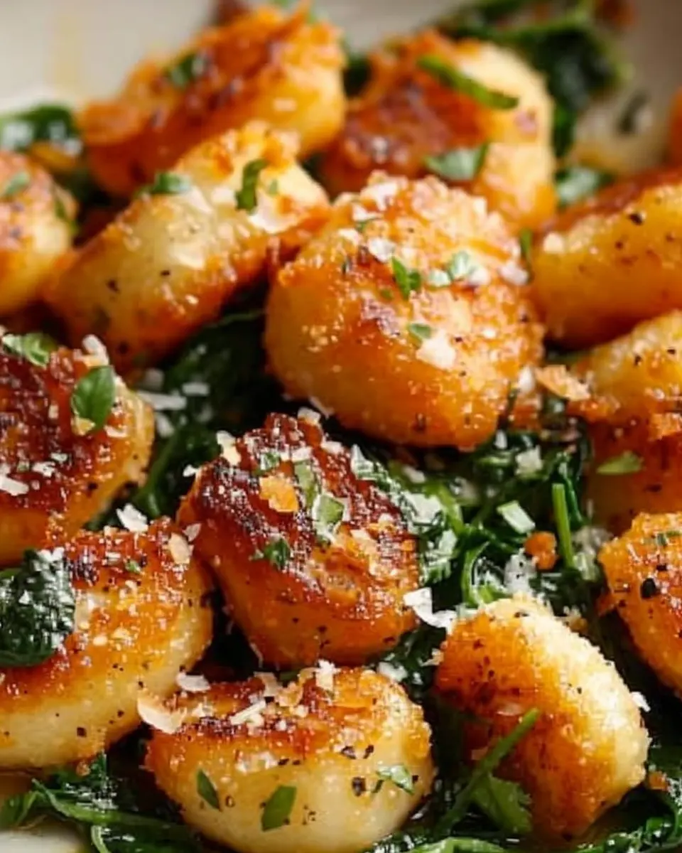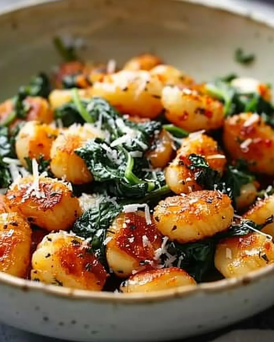 Now, let’s elevate those crispy gnocchi by adding garlic and spinach. Once your gnocchi are beautifully crispy, toss in minced garlic (about 2-3 cloves) and a handful of fresh spinach.
