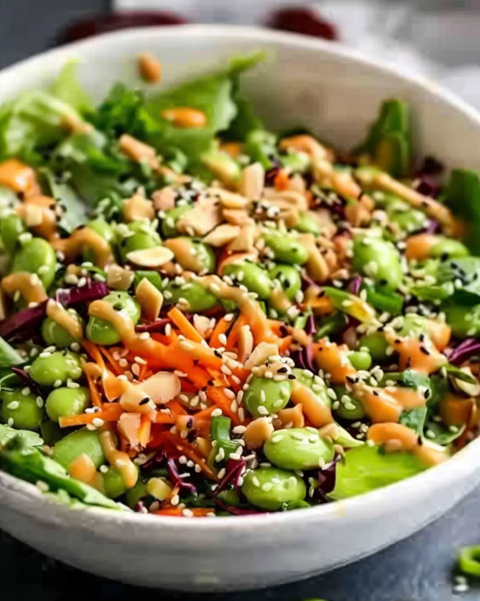 What sets Crunchy Asian Edamame Salad apart is its zesty peanut dressing.