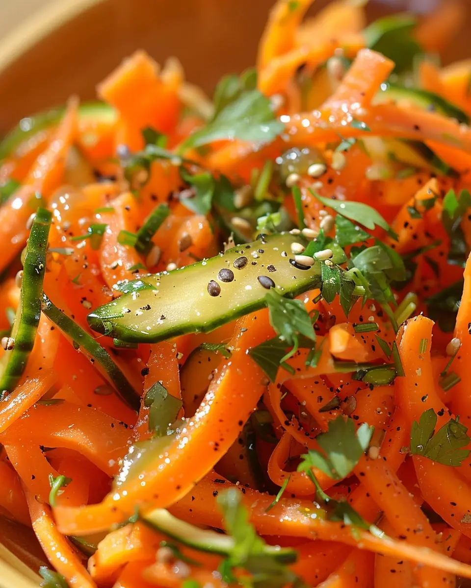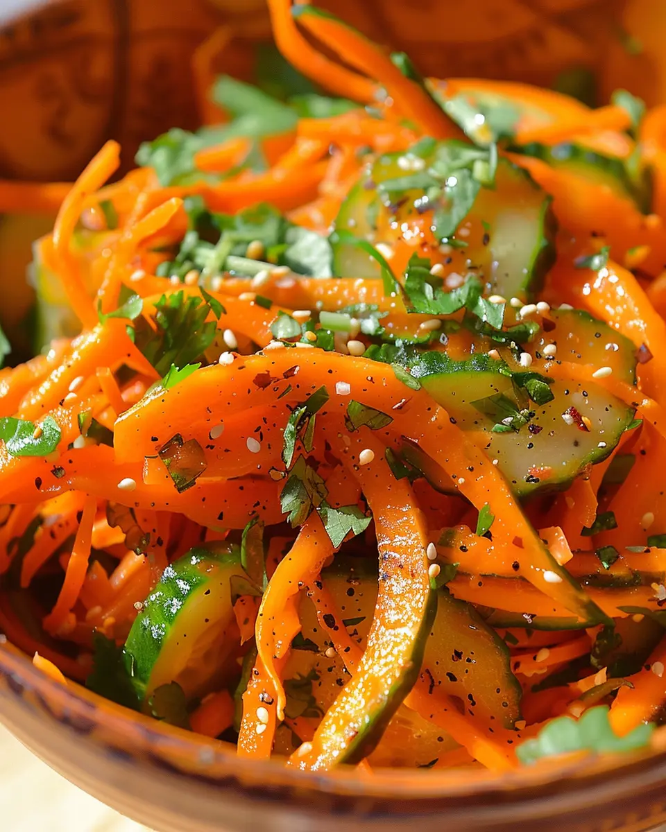 A refreshing and easy-to-make salad that combines the crispness of cucumbers with the sweetness of carrots.