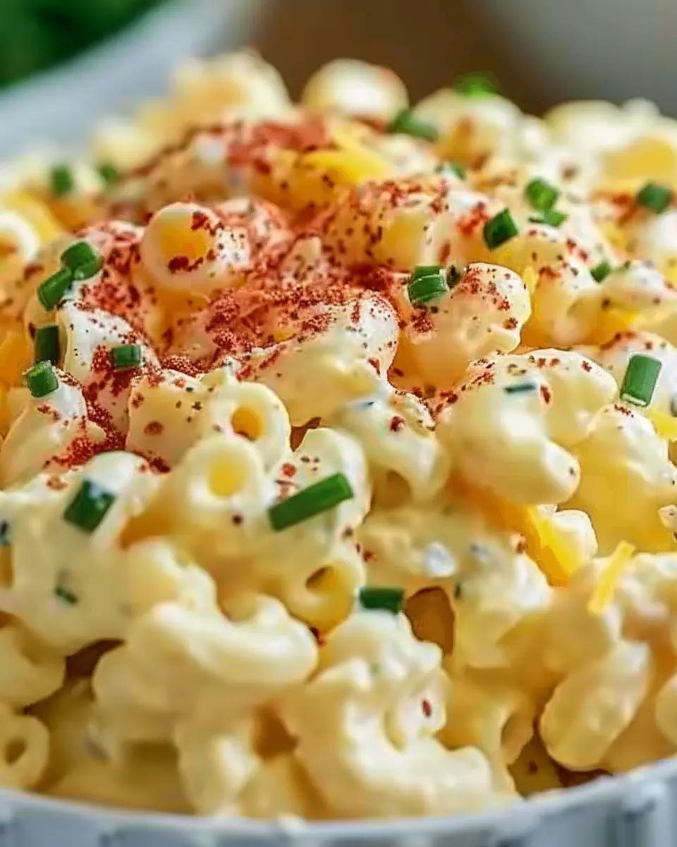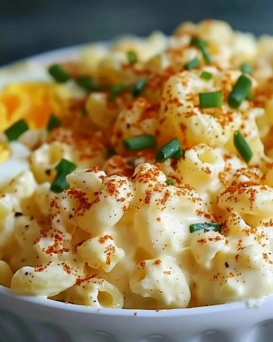 A delicious twist on the classic macaroni salad featuring deviled eggs for a creamy flavor.