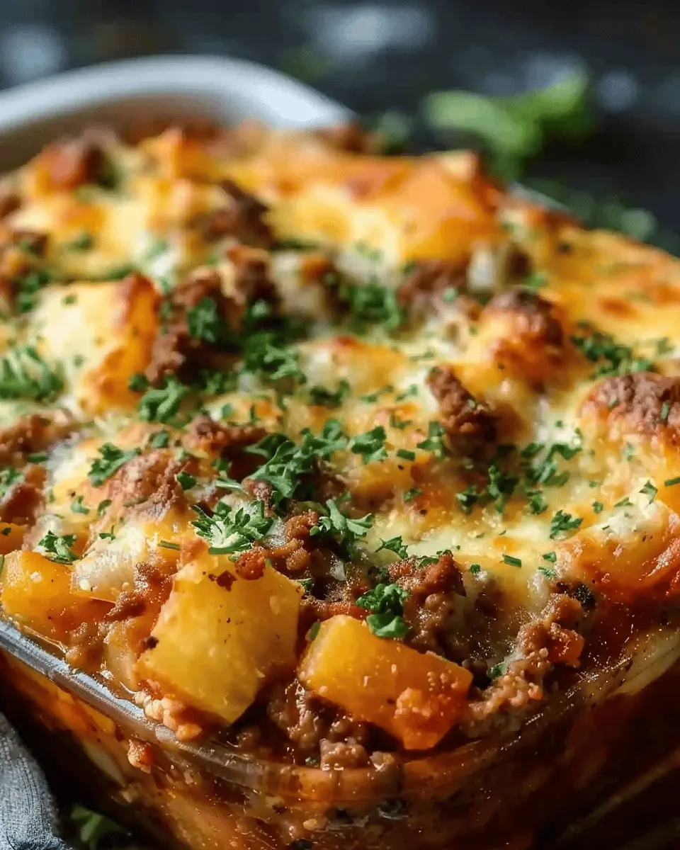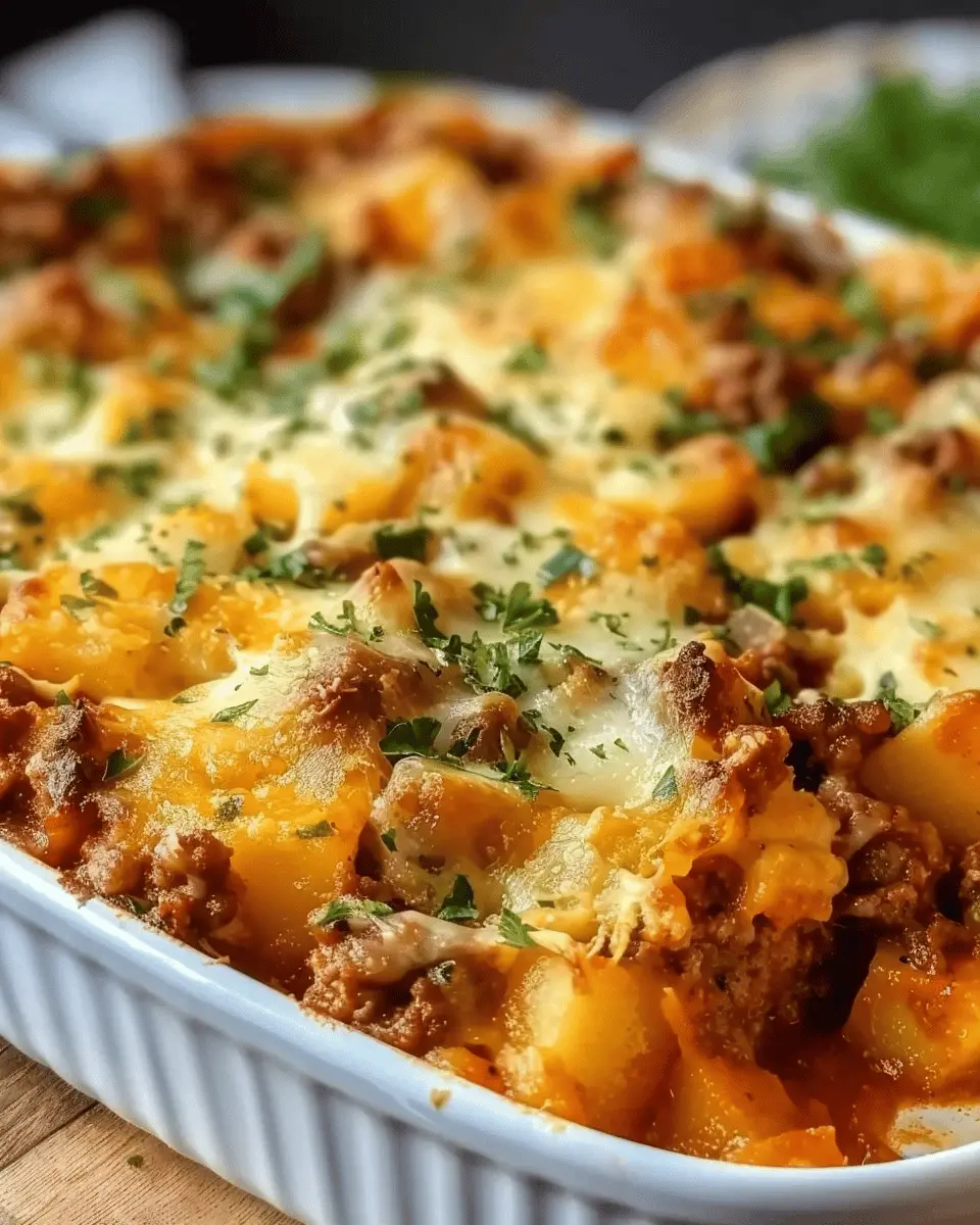 Now, pop the dish into a preheated oven at 350°F (175°C) and let it bake for about 40–45 minutes. You’ll know it’s ready when the potatoes are tender and the cheese is golden and bubbly.
