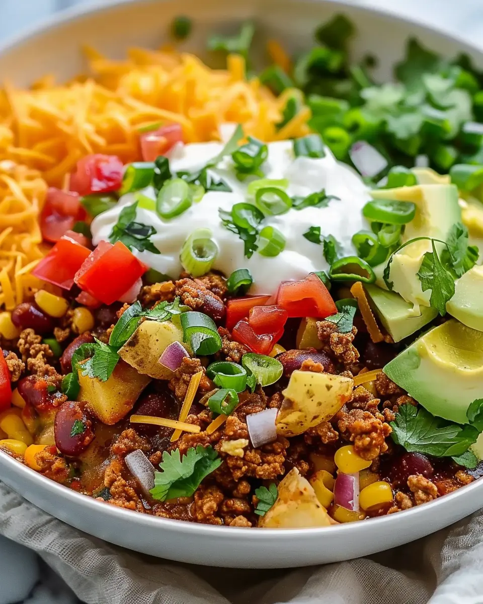 Enjoy a hearty Loaded Potato Taco Bowl packed with savory turkey bacon, loaded with flavors that comfort and satisfy.