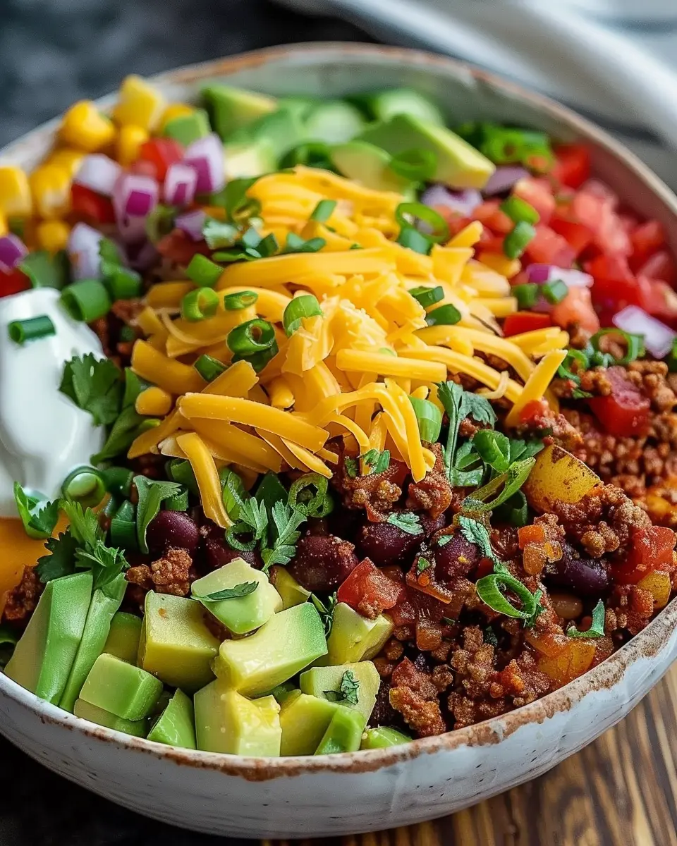 With both the potatoes and meat ready, it’s time to create the masterpiece that is your loaded potato taco bowl.