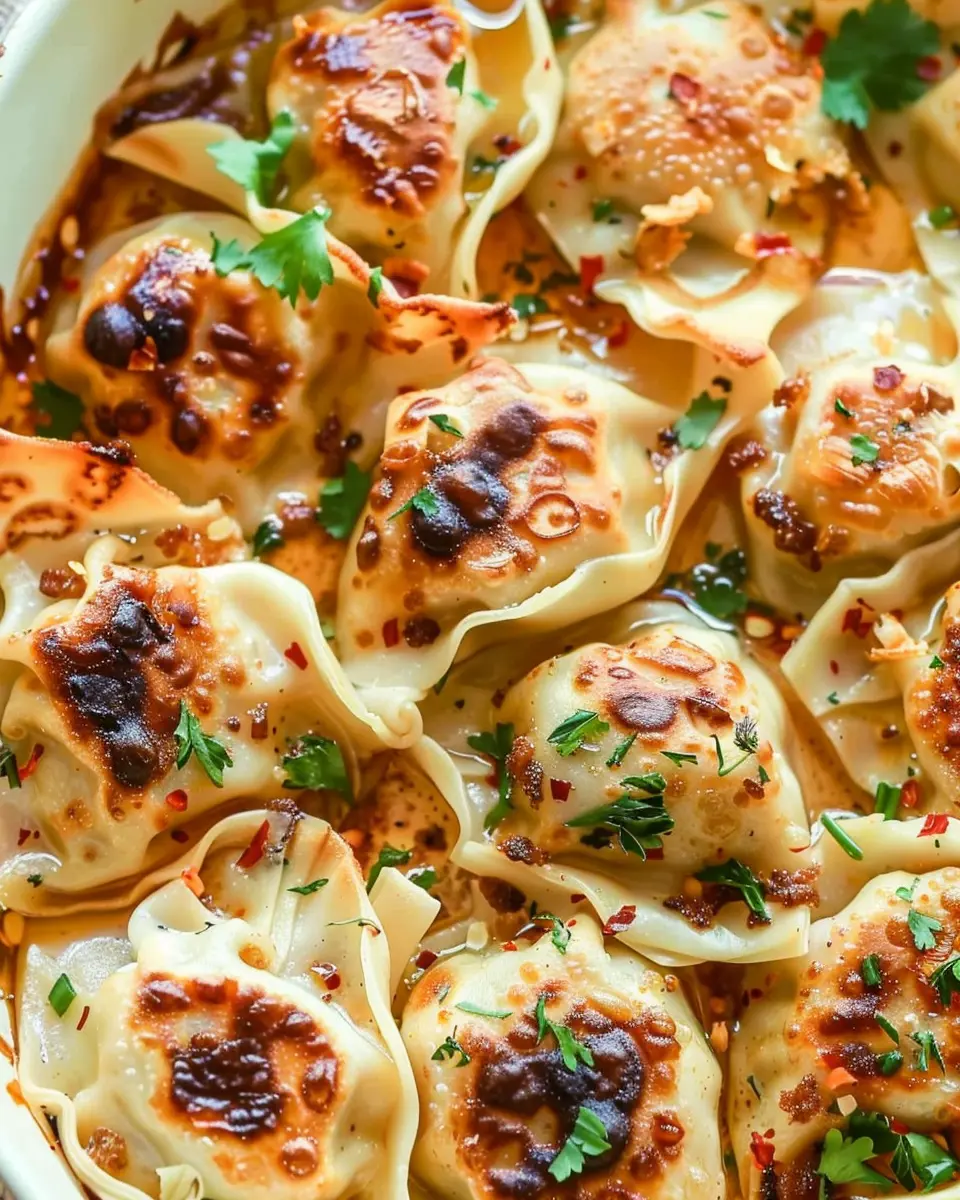 Once your dumplings are beautifully golden and crispy, it’s time to add the finishing touches. Remove the dish from the oven and let it cool slightly. Garnish your baked dumplings with some freshly chopped green onions or sesame seeds for that added flair. If you enjoy a little heat, don’t hesitate to sprinkle some red pepper flakes on top!