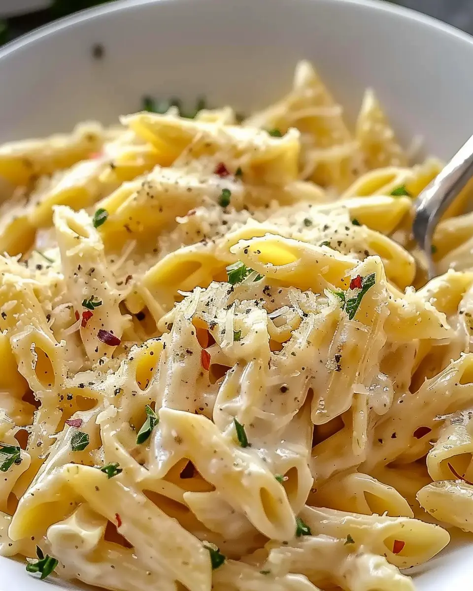 A simple and flavorful one-pot creamy garlic pasta with turkey bacon, perfect for a quick dinner.