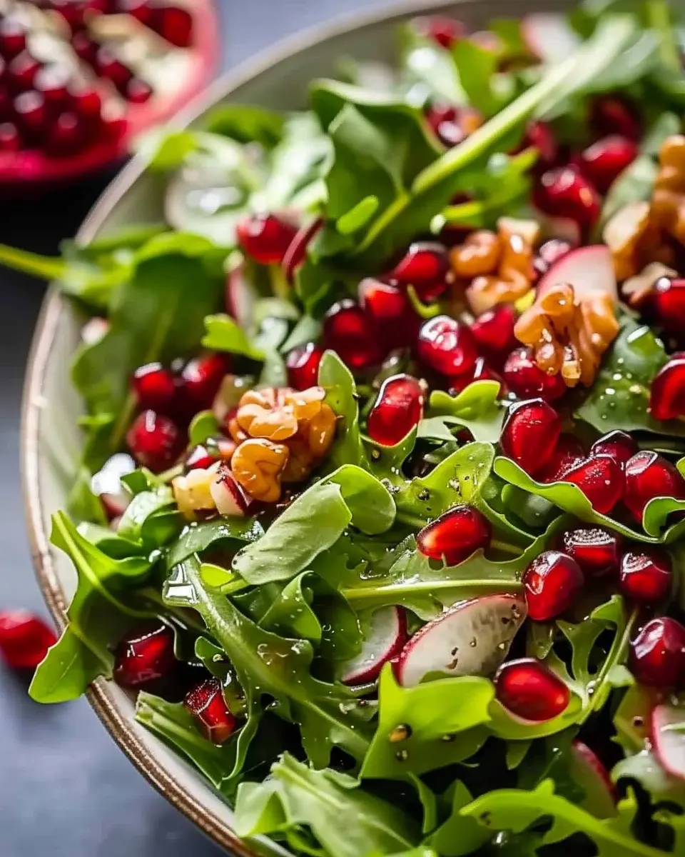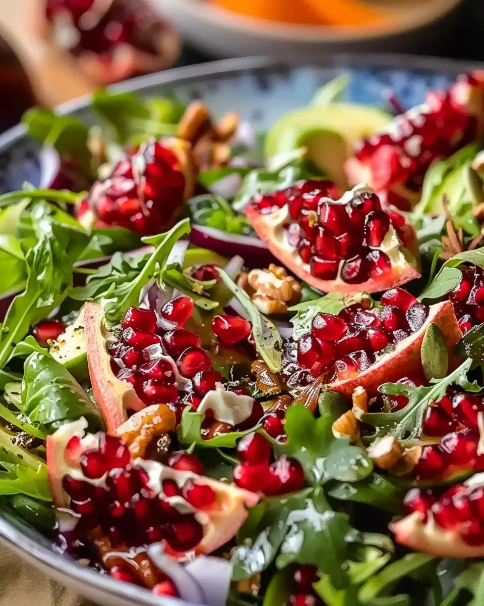 To add that extra touch, serve the salad with a side of fresh crusty bread or a light soup. You could also sprinkle some extra pomegranate seeds on top for an added burst of color. Giving your dishes an inviting presentation can elevate the overall dining experience, making even a simple salad feel like a festive banquet.