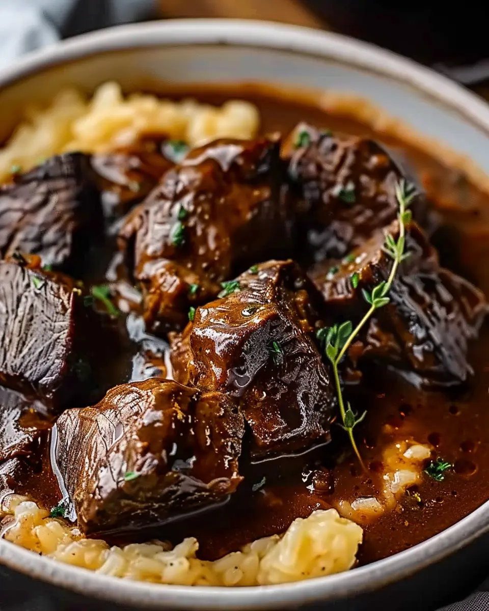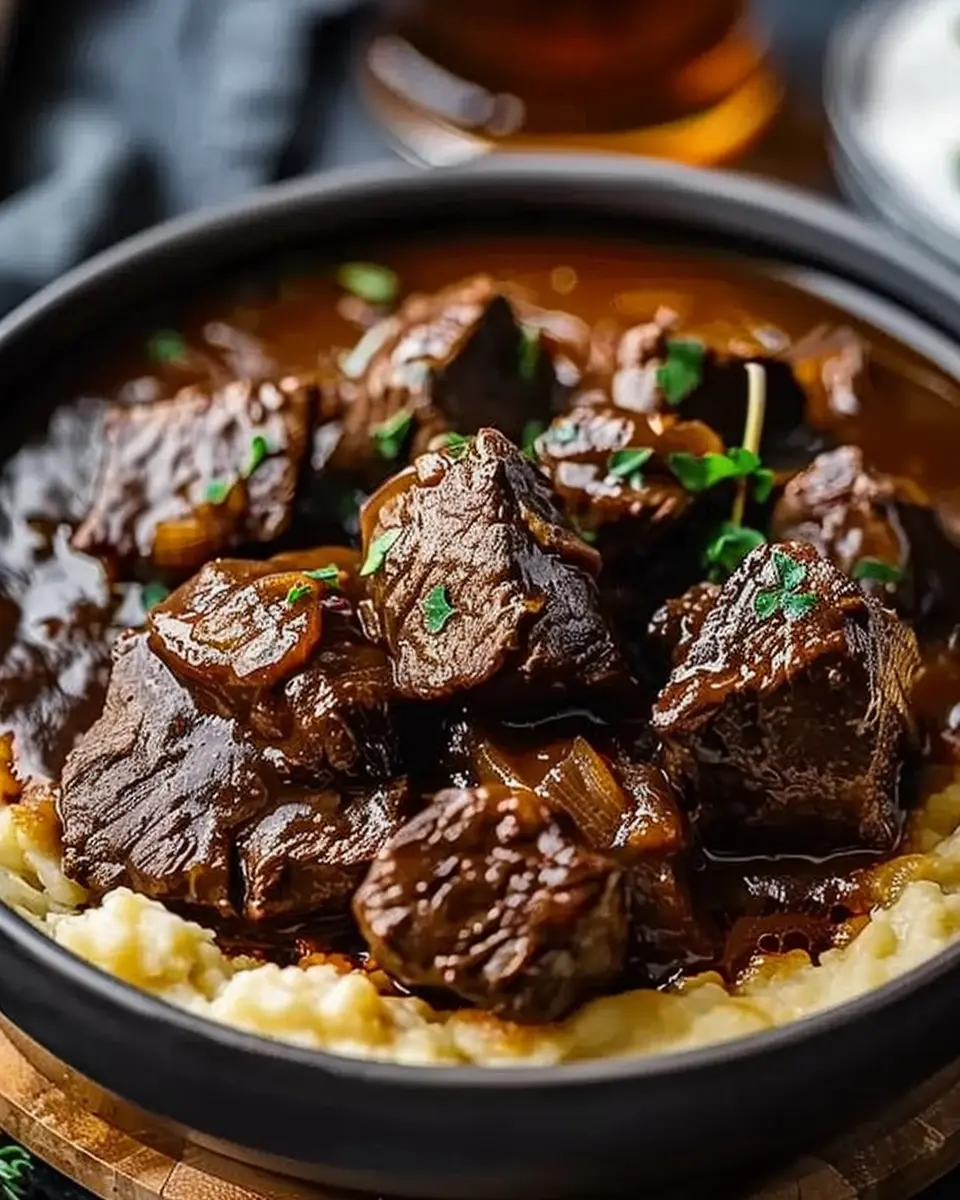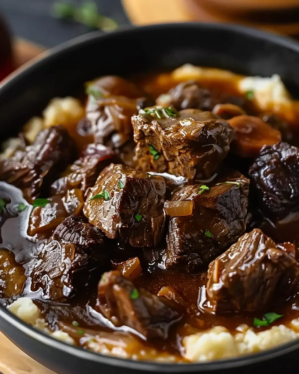 - Layered Serving: Serve the beef over a mound of mashed potatoes in a shallow bowl for an appealing layered look.