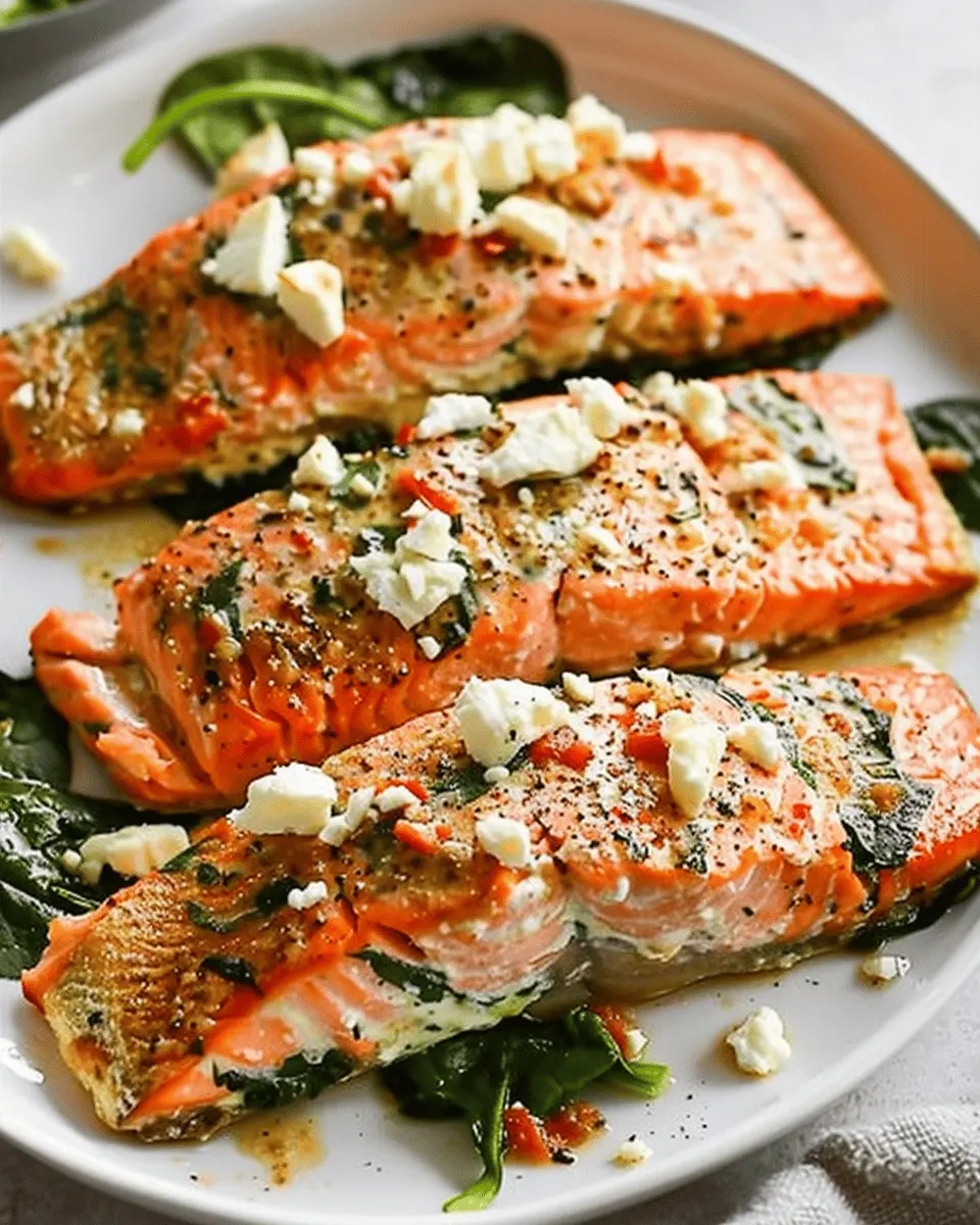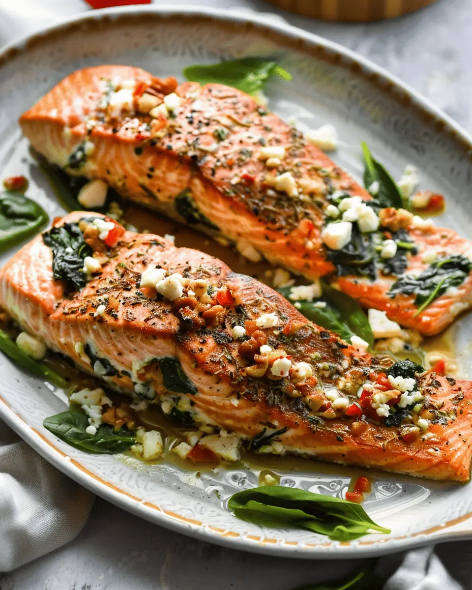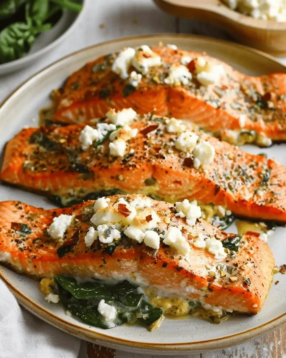 A delicious and juicy stuffed salmon recipe combining fresh spinach and feta cheese for a flavorful meal.